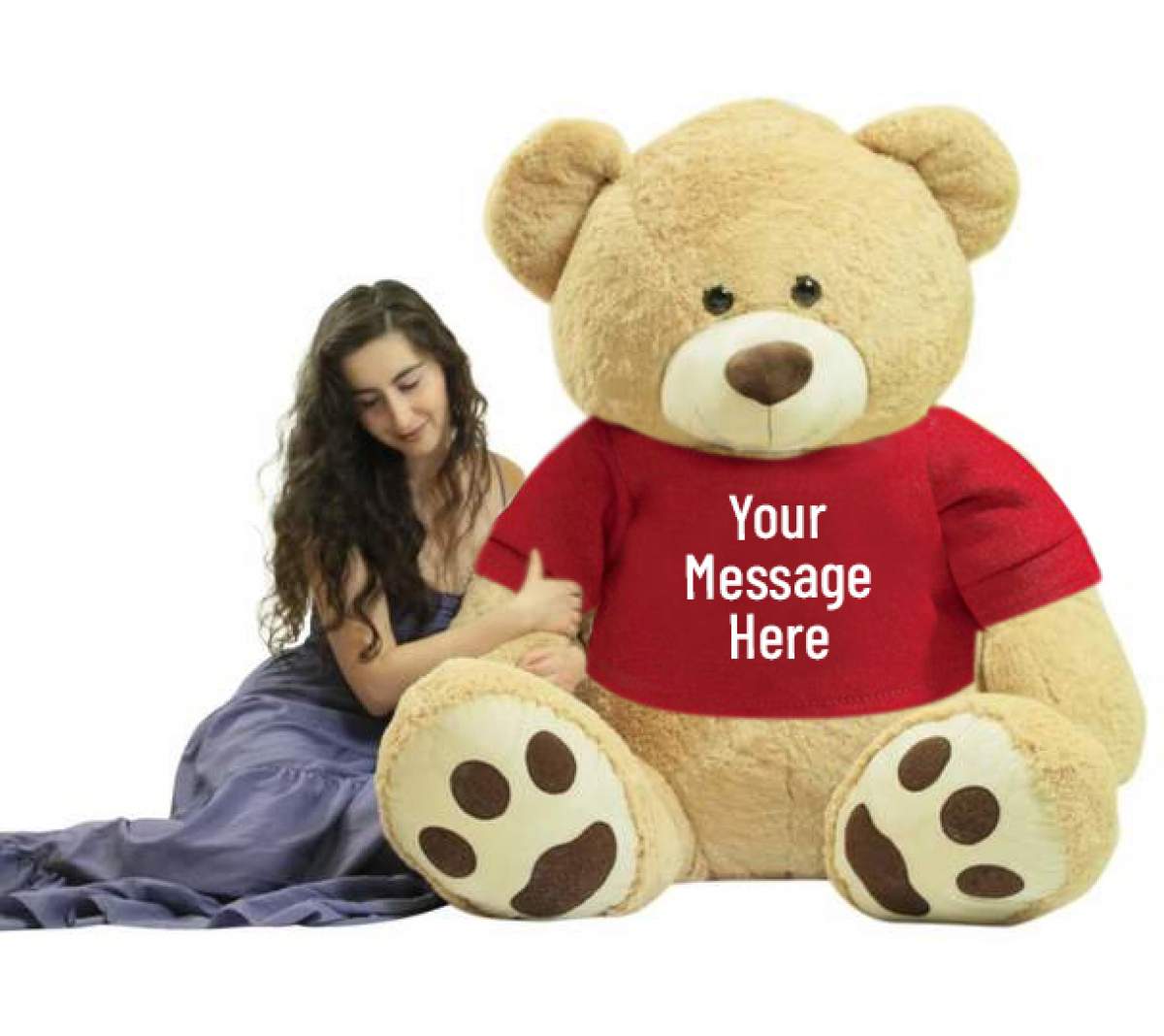 Customize Your Message on this huge teddy bear's red color t-shirt to send the most awesome and unique gift that lets you express your feelings.