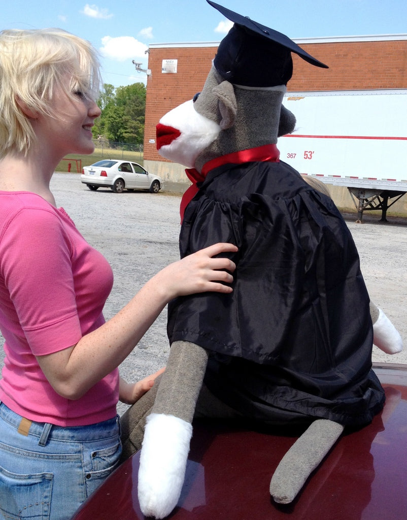 American Made Giant Graduation Sock Monkey Four and One Half Feet Tall Wearing Graduation Cap and Gown Made in the USA