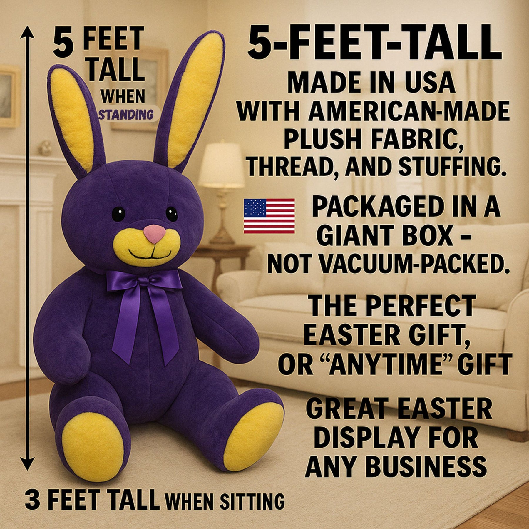 This awe-inspiring, fantastic GIGANTIC stuffed Bunny Rabbit conforms to all child safety standards. Kids and adults alike will LOVE this real-looking LARGER-THAN-LIFE SIZE BUNNY.